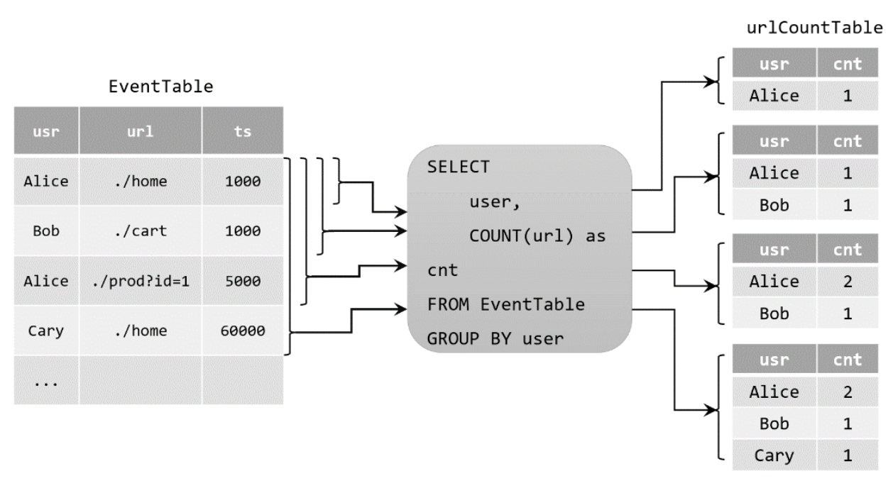 如果我们希望把流数据转换成表的形式,那么这表中的数据就会不断增长;如果进一步基于表执行 SQL 查询,那么得到的结果就不是一成不变的,而是会随着新数据的到来持续更新。