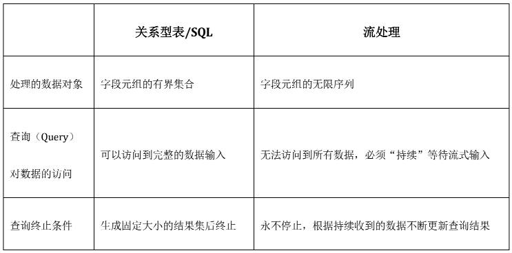 流处理面对的数据是连续不断的,这导致了流处理中的“表”跟我们熟悉的关系型数据库中的表完全不同;而基于表执行的查询操作,也就有了新的含义。