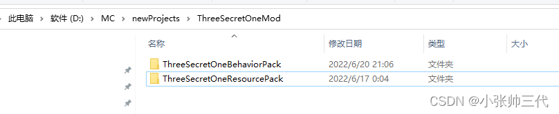 进入mod文件夹中。进入后创建两个文件夹,分别为ThreeSecretOneBehaviorPack 和 ThreeSecretOneResourcePack ,分别代表此mod的行为包和资源包。