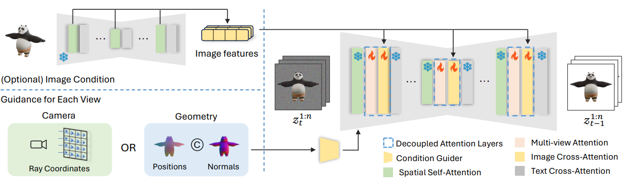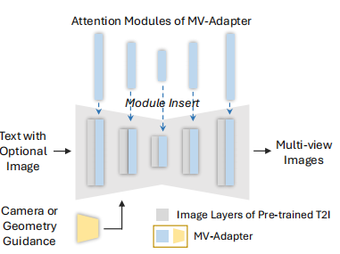 下图展示了MV-Adapter的overview。它包含两个部分:(1)用于编码camera(相机)或几何条件的条件引导器【Condition Guider】;(2)解耦的注意力层,包含了用于学习多视角一致性的【Multi-view Attention】,和可以选择的【image Cross-Attention】图像交叉注意力模块(用于支持图像条件生成,使用时会采用预训练的U-Net编码参考图像细粒度的信息)。训练完毕后,MV-Adapter能嵌入任何个性化的或蒸馏的T2I(文生图模型),中利用底模的特定优势生成多视角的图像。