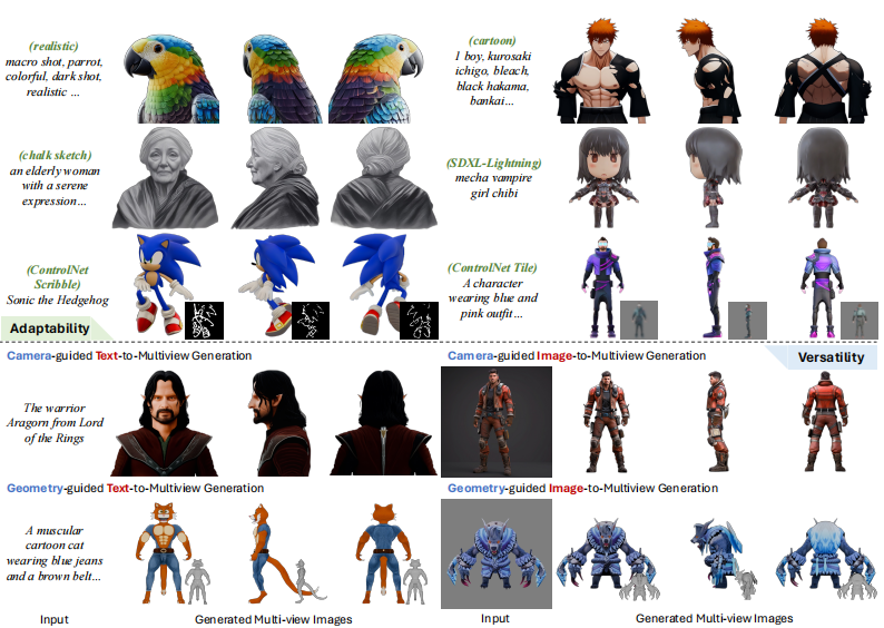 下图中第1、2、3行分别展示了将MV-Adapter嵌入个性化的T2I模型、蒸馏后的few-step T2I模型、ControlNet模型的结果,彰显了它的适应性。下图的第5、6行则展示了不同控制信号的输出结果,包括了使用文本或图像输入来进行view-guided或geometry-guided的生成,突出了它的多用途能力。