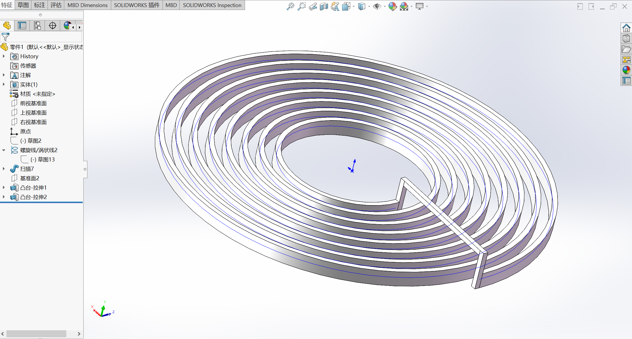 SolidWorks绘制Maxwell仿真用带桥接的三维平板螺旋线圈 在使用Maxwell进行电磁场仿真时,经常需要绘制各种异形线圈,由于Maxwell中激励的设置要求:要么进出位于空气域的两个边界,要么线圈为闭合的。所以为了建模方便定义激励,在建立几何时将线圈进行桥接,但是Maxwell软件几何建立的方式比较鸡肋,所以本文介绍使用SolidWorks建立三维的平板螺旋线圈。本文在拉伸几何介绍了两种方法,如果赶时间可以在第二、三节任选一节看也能完成几何建立。