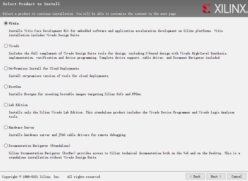 2.这里选项很重要!!选择vitis,我查了下,你选择vitis相当于选择了全家桶,包括了vitis + vivado,如果选择下面vivado选项的话,那么就没有vitis IDE.就不能进行PS端开发。