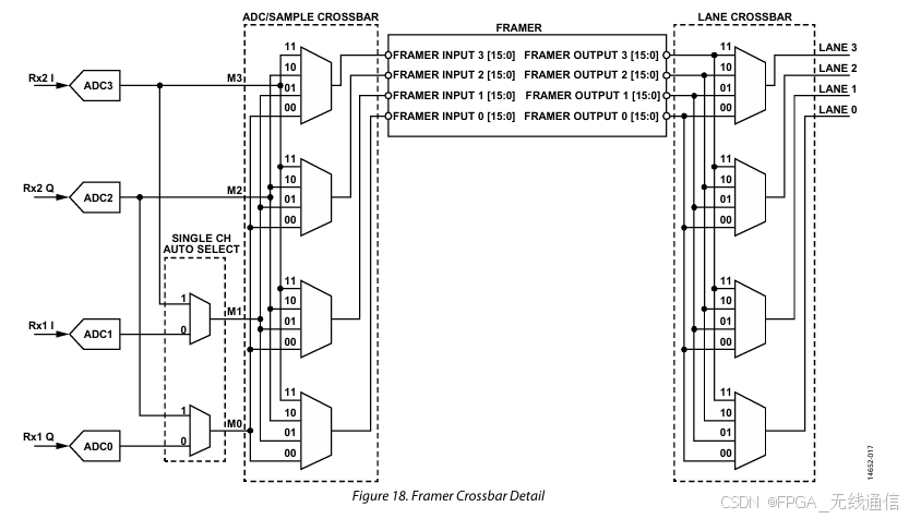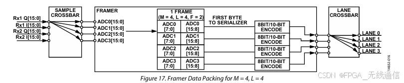 通过上图(RX相同),根据以下2个参数,确定了Lane的走线以及与Tx 的对接关系,通过该关系,就知道了I Q 的排序,即{Tx2Q, Tx2I, Tx1Q, Tx1I};rx也是相同原理,这样就能够确定在jesd204b的数据接口,其 I Q 数据谁放低位,谁放高位;