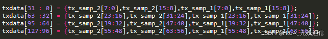 假设TX1I[15:0],TX1Q[15:0],TX2I[15:0],TX2Q[15:0],如何赋值给FPGA接口 axis_tx_tdata[127:0]接口?