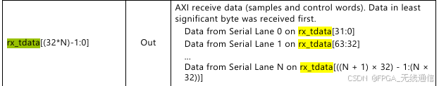 上图,Lane0对应RX1I,在xlinx IP中 Lane0 为32位,而 Rx1I 为16位,所以Rx1I到Lane0的映射关系应该是 2 个16位的 Rx1I 映射到Lane0的32位,且每个16位的高8位即[15:8]先输出,其次为[7:0]; TX相同,Lane0对应2个Tx1I的输出;