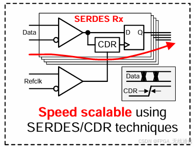 Jesd204使用serdes技术,高速接口的时钟是从数据中使用CDR技术调制参考时钟的时钟相位位置,对齐数据有效采样窗完成的采样;