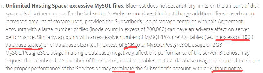 大多数虚拟主机都吹嘘他们可以都是无限主机,Bluehost也不例外,但是在它的Terms of Service的user agrement条款,Unlimited Hosting Space; excessive MySQL files里面说的很清楚,超过3 GB或者1000个database tables,在不通知你的前提下会终止你的账户。