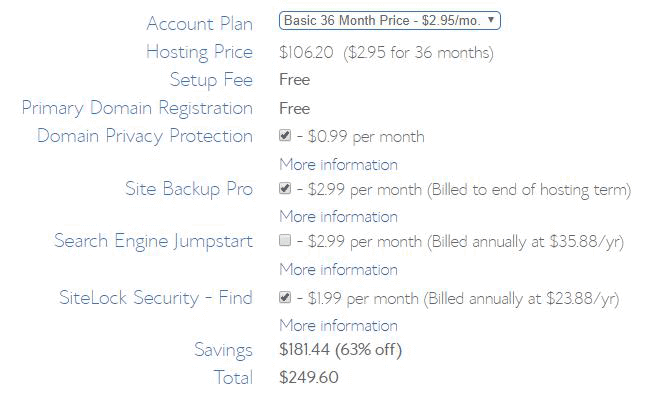 2.95美元/月这是连续3年的主机费用。在下面,bluehost会默认勾选三个选项Domain privacy protection、Site Backup Pro以及Sitelock Security,总价格是249.6美元。如果这三个都不要是106.2美元。