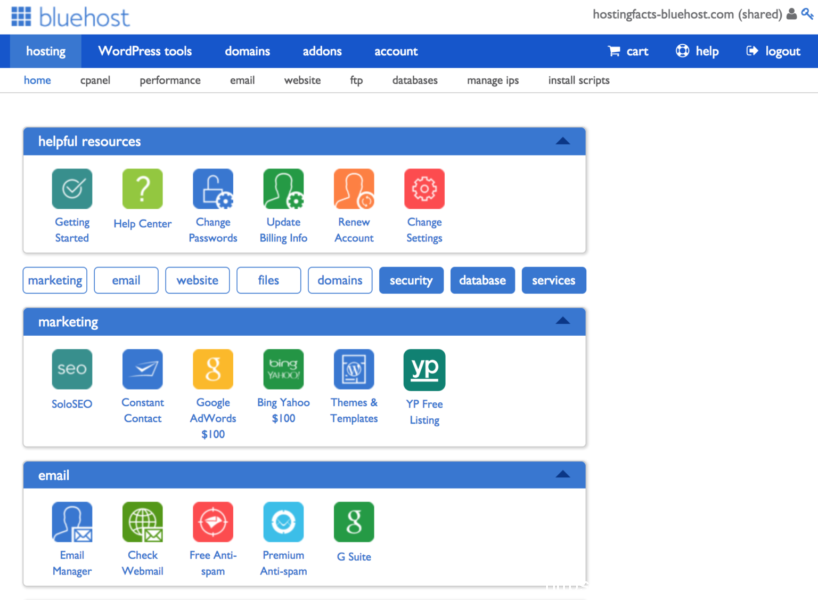 Bluehost后台仪表盘(dashboard)将各种各样的服务选项全部整合在一起,比如google app以及前面提到的CloudFlare等等