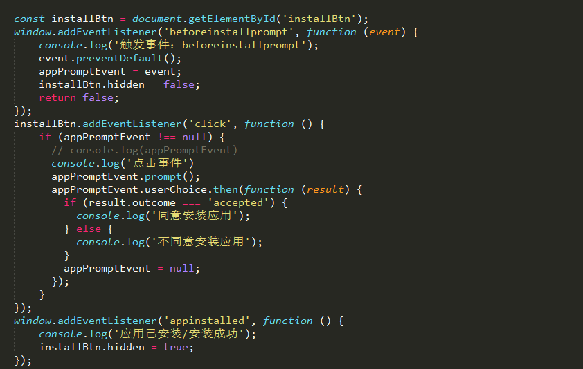 里面的start_url参数进行配置,可以通过对url添加后缀进行区分,例如"start_url": "/?pwa=client", 通过客户端启动的url后缀会添加pwa=client,如果是通过网页访问则没有改后缀,具体判断方式如下。前言:上一篇文章分享了pwa如何添加到主屏幕,本文分享下如何进行通过pwa桌面图标打开网页、以及通过点击事件是否安装的事件统计。1、pwa 安装除了被动触发,也可以通过点击事件,由用户主动触发,对于用户更加友好;然后新建一个js文件进行逻辑处理。此处可以通过配置文件(