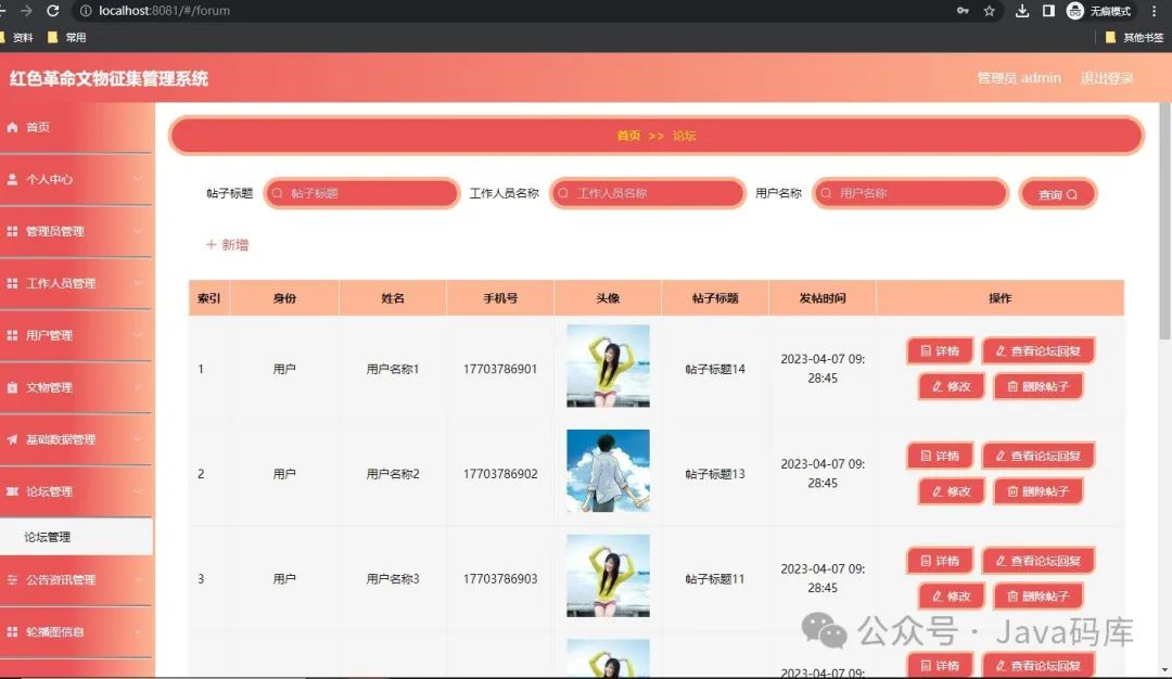 如图5.3显示的就是论坛信息管理页面,此页面提供给管理员的功能有:根据论坛信息进行条件查询,还可以对论坛信息进行新增、修改、查询操作等等。