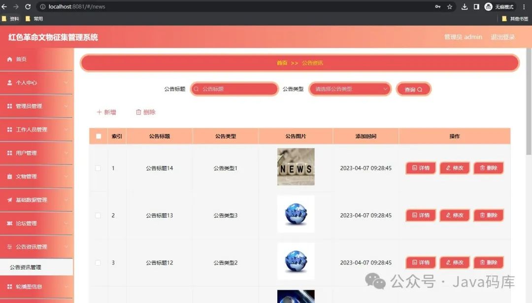 如图5.4显示的就是公告信息管理页面,此页面提供给管理员的功能有:根据公告信息进行新增、修改、查询操作等等。