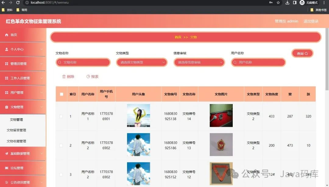 如图5.2显示的就是文物信息管理页面,此页面提供给管理员的功能有:查看已发布的文物信息数据,修改文物信息,文物信息作废,即可删除,还进行了对文物信息名称的模糊查询 文物信息信息的类型查询等等一些条件。