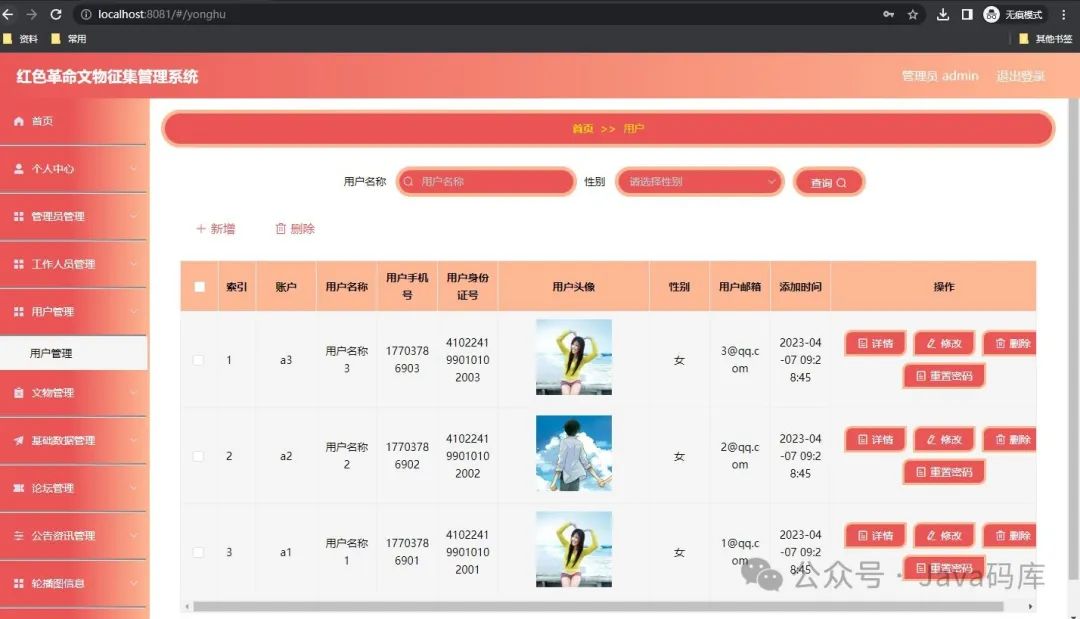 如图5.1显示的就是用户信息管理页面,此页面提供给管理员的功能有:用户信息的查询管理,可以删除用户信息、修改用户信息、新增用户信息,