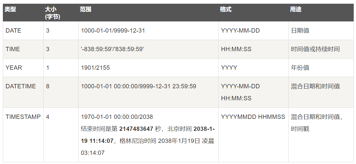 year(2/4) | YEAR | 如果 yearIsDateType 配置设置为 false,返回的对象类型为 java.sql.Short;如果设置为 true(默认为 true),返回的对象类型是 java.sql.Date,其具体时间是为一月一日零时零分 |