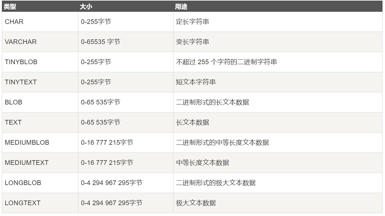 varchar(M) [binary] | VARCHAR | java.lang.String(除非该列字符集设置为 BINARY,那样返回 byte[]) |