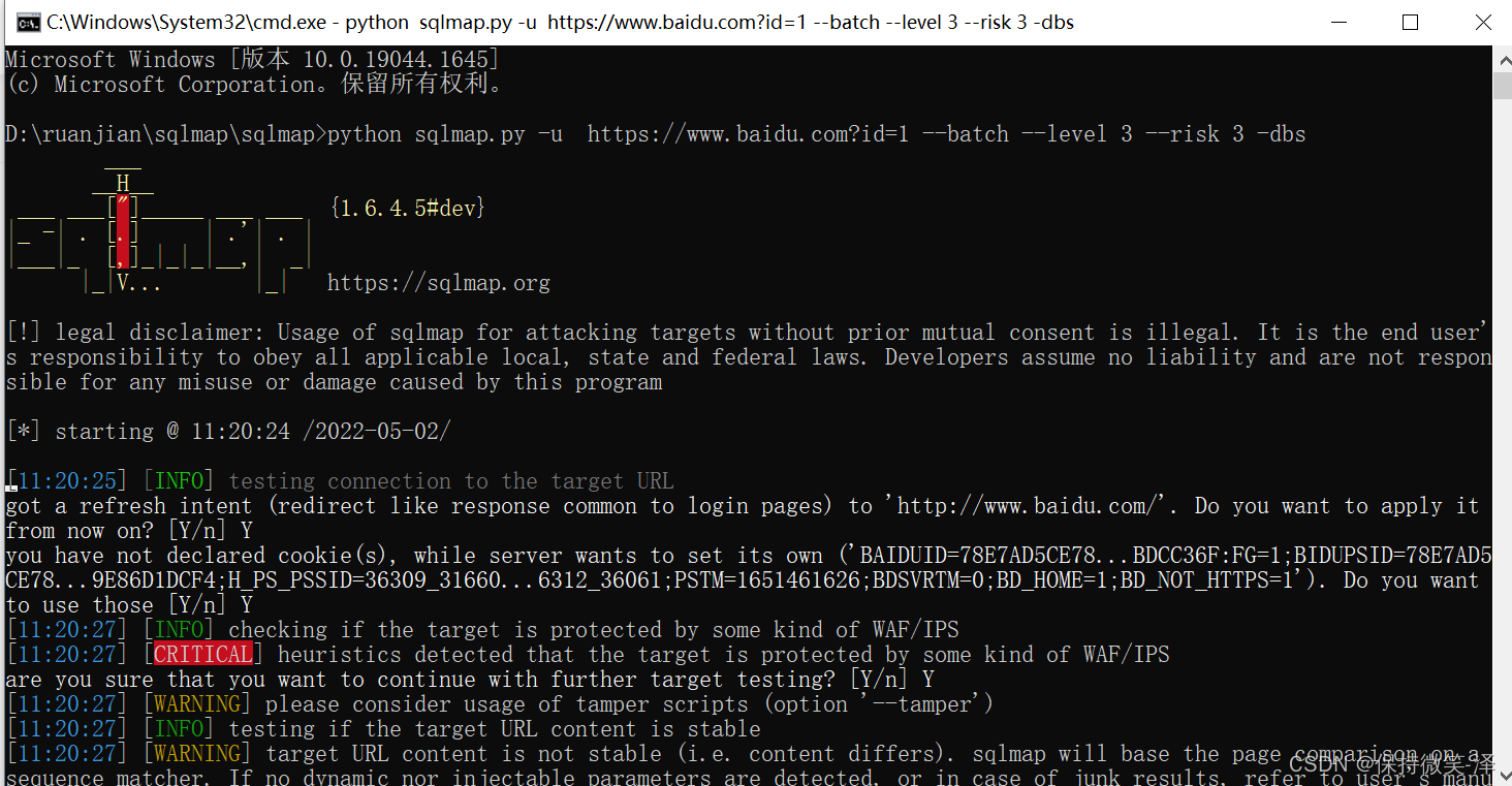 python sqlmap.py -u https://www.baidu.com?id=1 --batch --level 3 --risk 3 -dbs