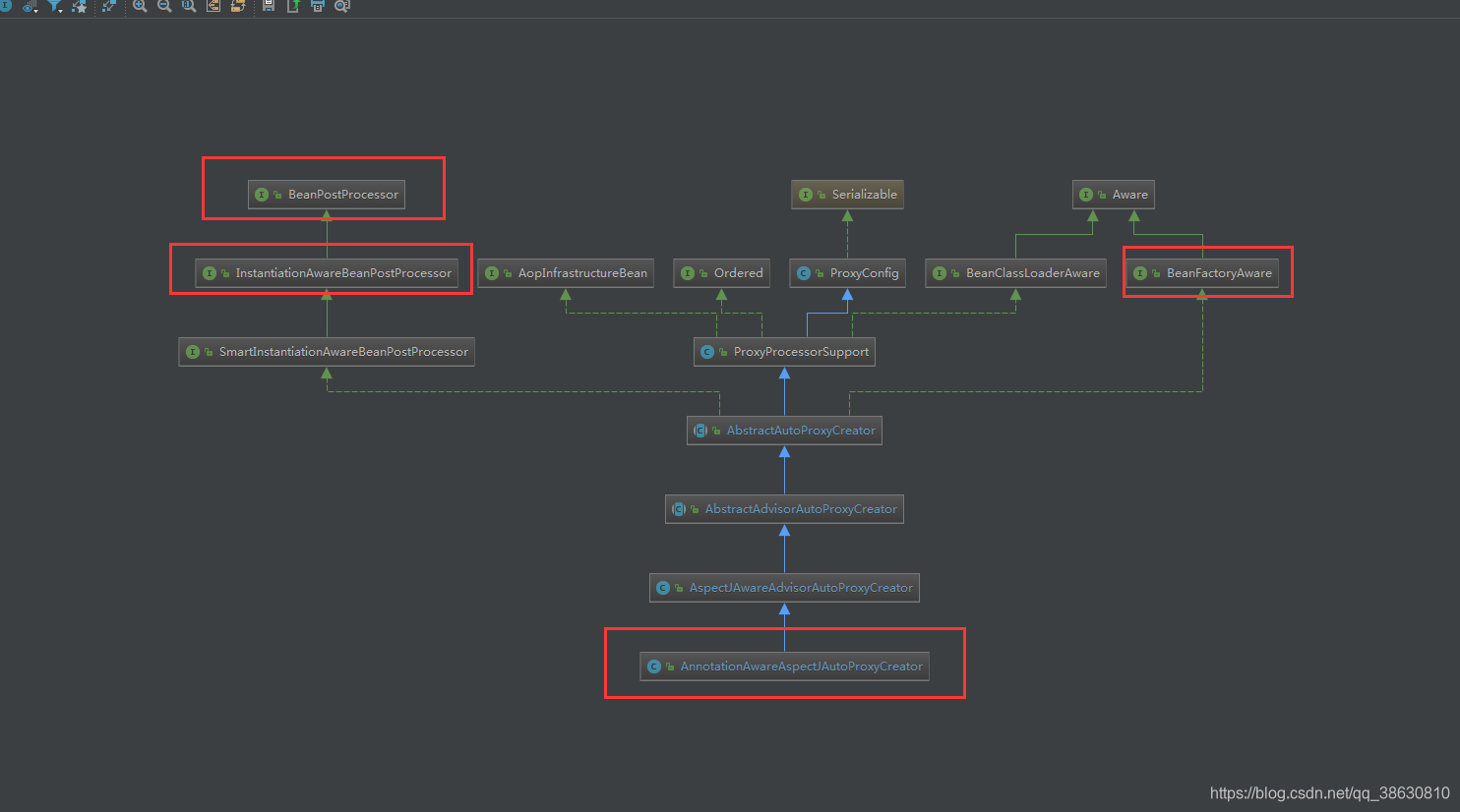 然后我们根据集成图,来看一下AnnotationAwareAspectJAutoProxyCreator干了些什么: