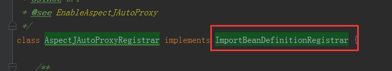 当我们进入到AspectJAutoProxyRegistrar这个类的时候,看到了他实现了ImportBeanDefinitionRegistrar这个类,ImportBeanDefinitionRegistrar这个有必要说一下,在我前几篇博客中提到过这个类,只要实现了ImportBeanDefinitionRegistrar,就可以往我们的容器中添加bean定义,那么他在这里的作用是什么呢?来看一下他的源码。