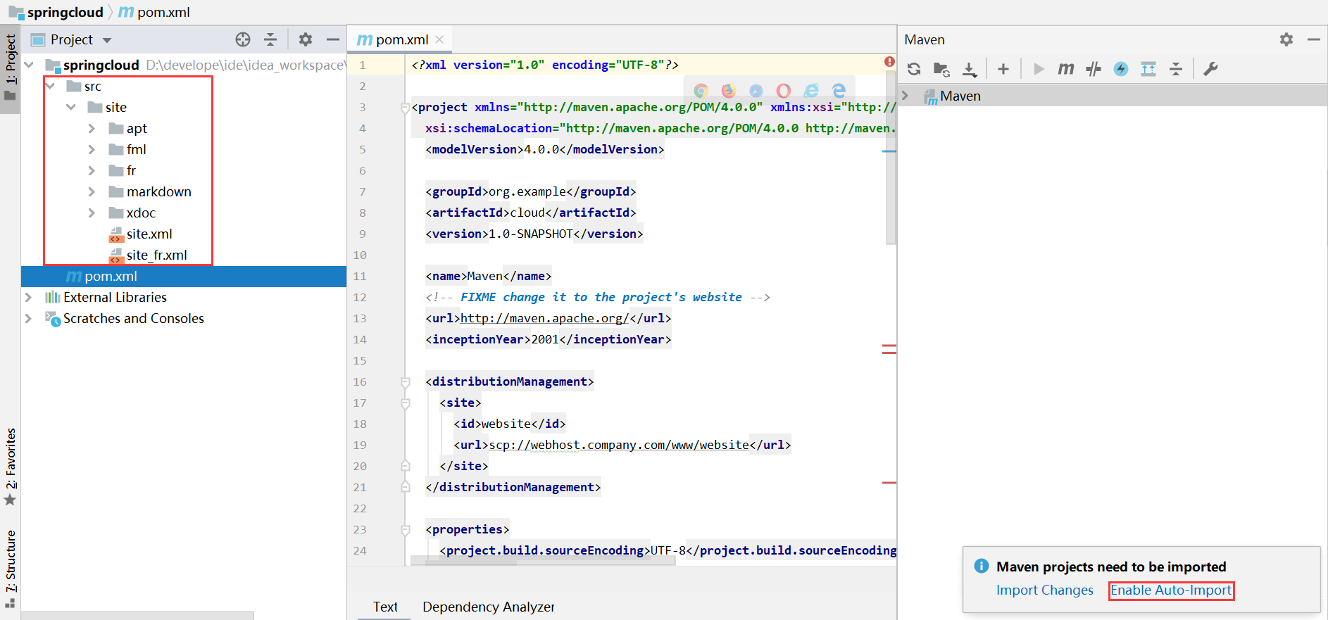 创建完成后,删除父项目下的整个src目录,父项目不做编码,只保留一个pom文件管理依赖,选择Enable Auto-import
