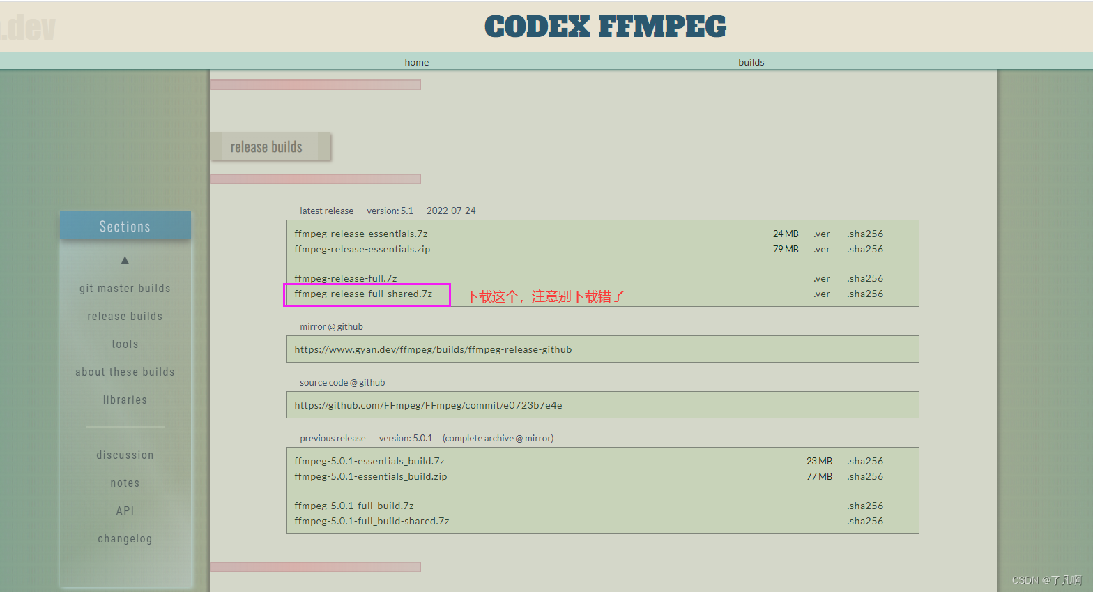 Windows下要使用FFmpeg可以直接下载官方现成的库,当然也可以自己通过源码进行安装,这里我们直接下载官方编译好的库。
