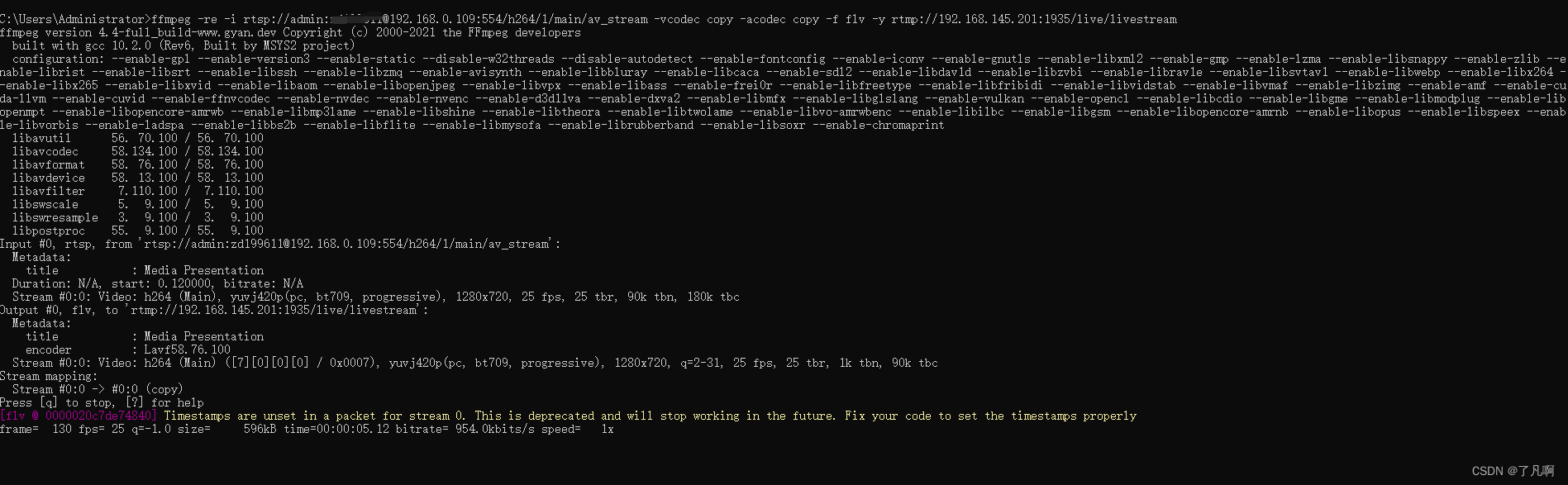 ffmpeg -re -i rtsp://admin:123456@192.168.0.109:554/h264/1/main/av_stream -vcodec copy -acodec copy -f flv -y rtmp://192.168.145.201:1935/live/livestream