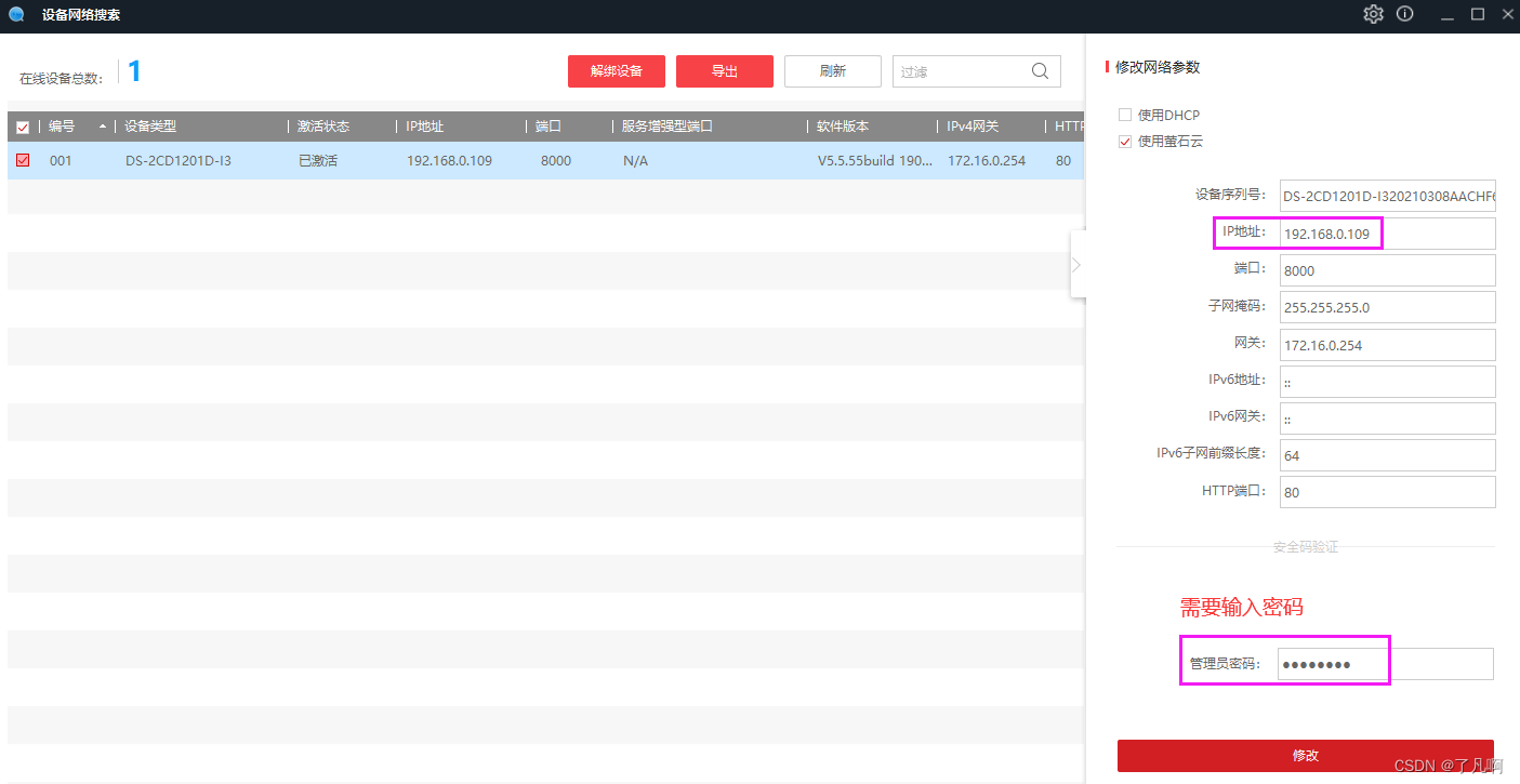 2.2.2、打开软件,修改摄像头的IP地址与你本地电脑的IP在一个网段下