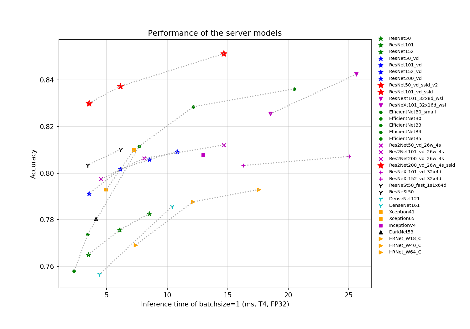 常见服务器端模型的精度指标与其预测耗时的变化曲线如下图所示。