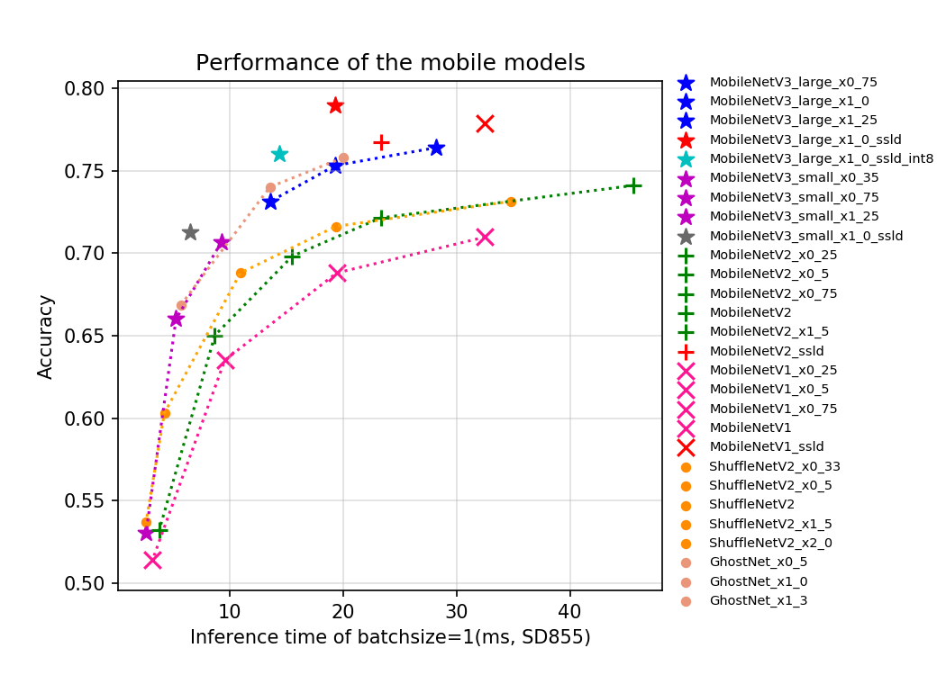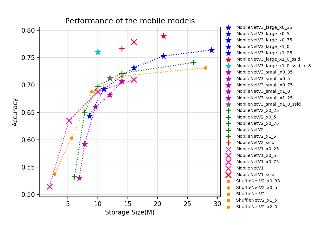 常见移动端模型的精度指标与其预测耗时、模型存储大小的变化曲线如下图所示。