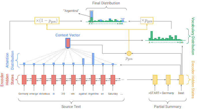 Tensorflow2自定义网络 2. Pointer-Generator Seq2Seq复制机制神经网络大致介绍和框架实现 网络大致介绍为了提升神经机器翻译质量,论文Get To The Point: Summarization with Pointer-Generator Networks 两个角度出发:减少网络翻译出现重复语句的情况尽可能从输入获取单词表外的单词,强化语义转换的同时,减少OOV的情况。基于此,提出了Coverage mechanism和Pointer-generator。Coverage mechanismCoverage vector计算来源于译码器0~t-1的注意力权重,用于Bahdana