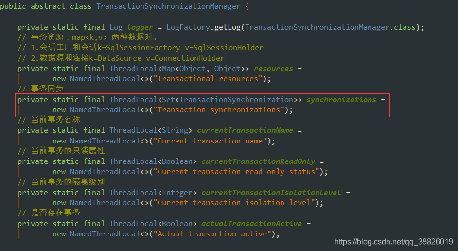 // 包括事务同步器、事务名称、只读属性、隔离级别、真实的事务激活状态