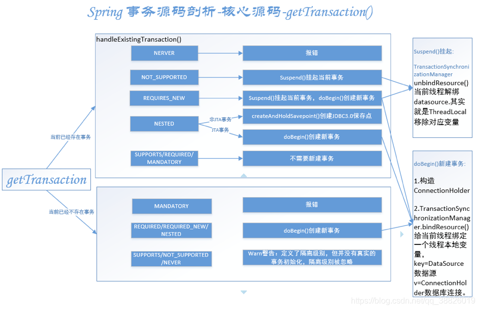 2) 如果是新的事务同步,解绑当前线程绑定的数据库资源,重置数据库连接