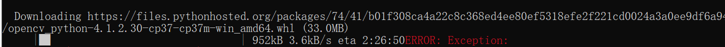 WARNING: Retrying (Retry(total=4, connect=None, read=None, redirect=None, status=None)) after connection broken by 'ReadTimeoutError("HTTPSConnectionPool(host='pypi.org', port=443): Read timed out. (read timeout=15)")': /simple/opencv-python/