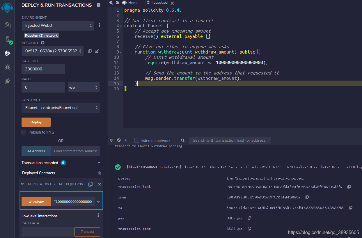 我们在合约地址下面输入我们需要转出的金额,转出的金额方法就是调用我们合约函数,转出金额我们需要用 " "符号,并且转出金额不能超过0.1ETH,因为我们合约里面做了限制转出数量,不然转出会报错。具体看下图:
