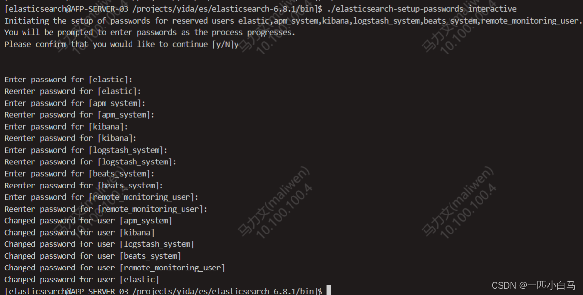 es安装和设置密码 会对elasticsearch、logstash、kibana分别设置登录密码(默认es用户名为elastic,logstash用户名为logstash_system,kibana用户名为kibana)官网下载 https://www.elastic.co/cn/downloads/past-releases/elasticsearch-6-8-1。2.1.1 安装x-pack (elasticsearch用户下操作)-u 指定用于认证的用户信息,用户名与密码使用冒号分隔。2.1.2 设置密码。