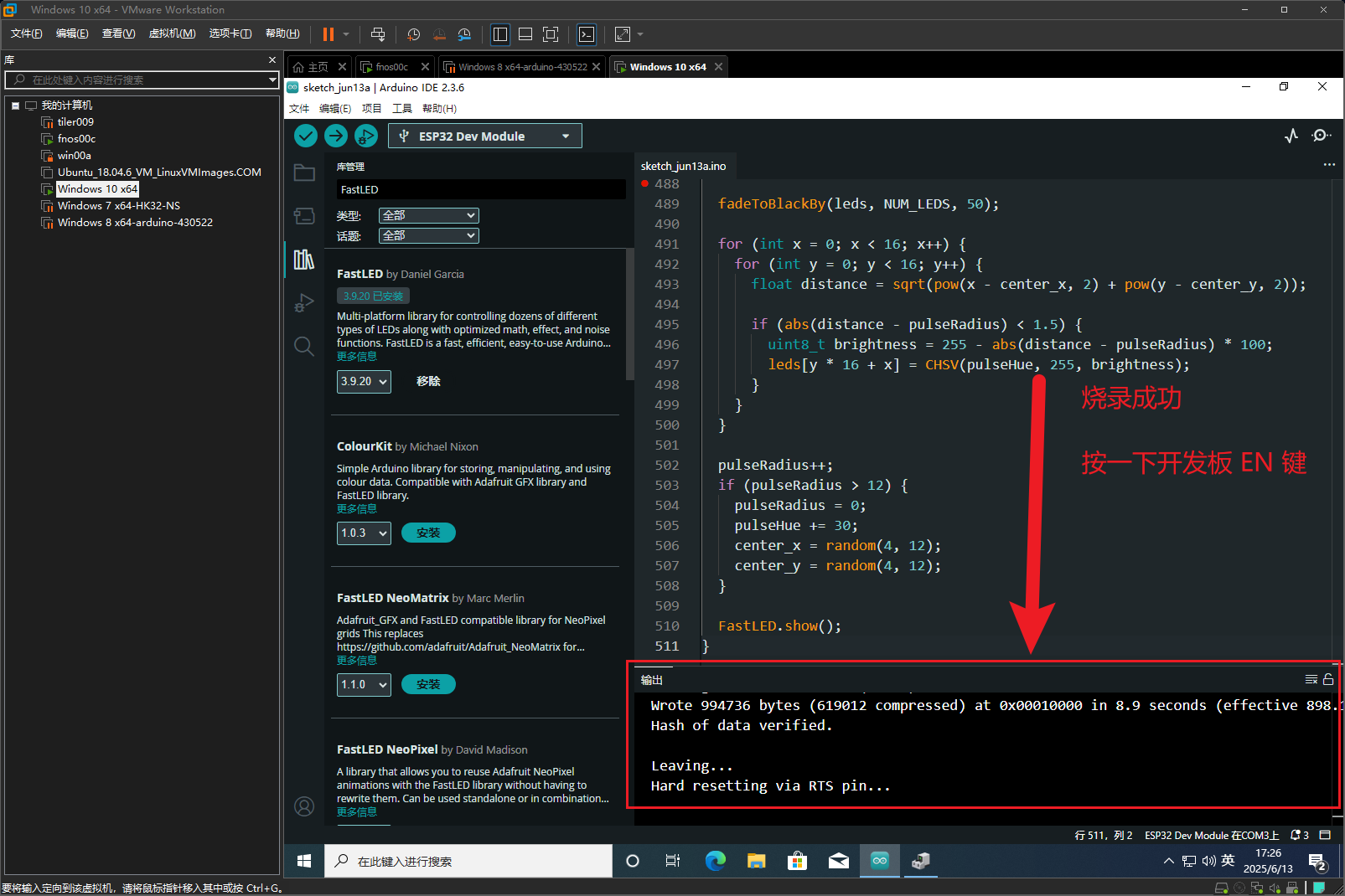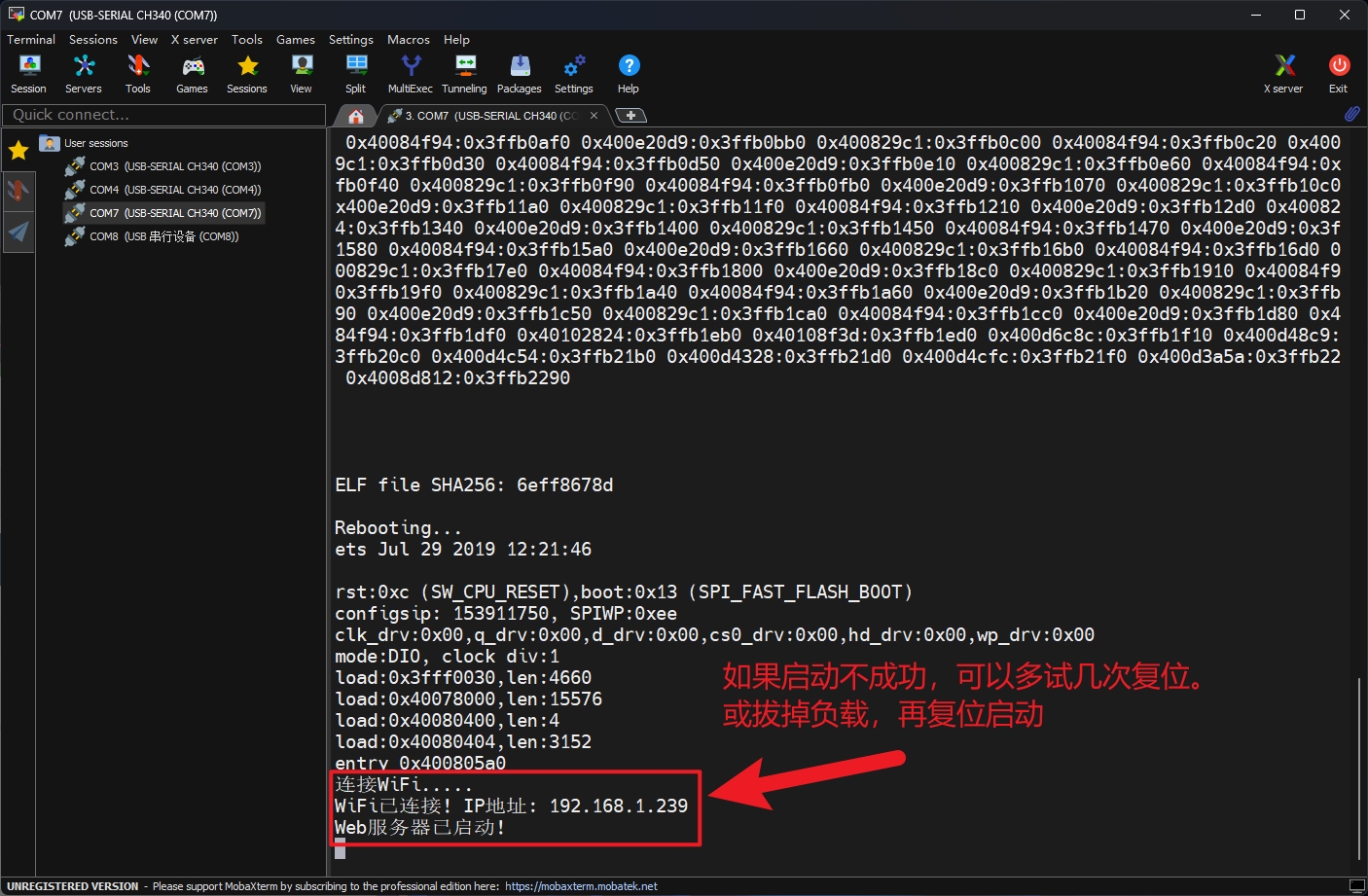 - 编译完成后,它会尝试上传。观察下方的输出窗口。如果显示 Connecting…_____…,有时需要按住 ESP32 板上的 “BOOT” 按钮,直到上传开始。