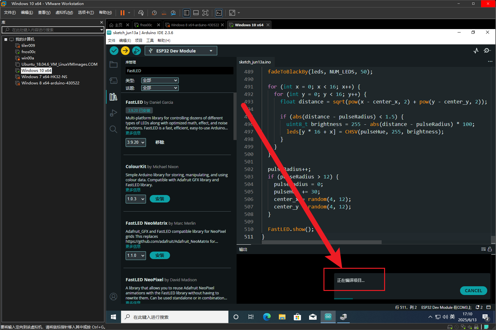 - IDE 会开始编译代码。首次编译 ESP32 代码会稍慢