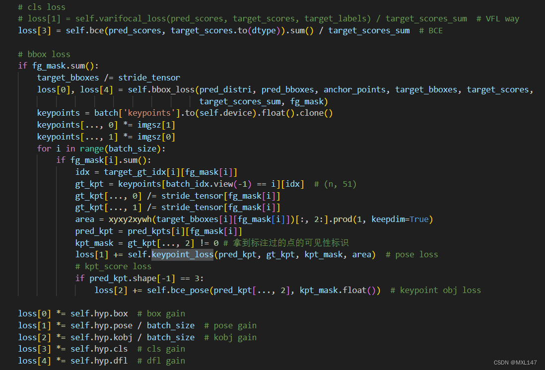 ultralytics\yolo\v8\pose\train.py中计算损失函数的function是“compute_loss”,进入PoseLoss类中