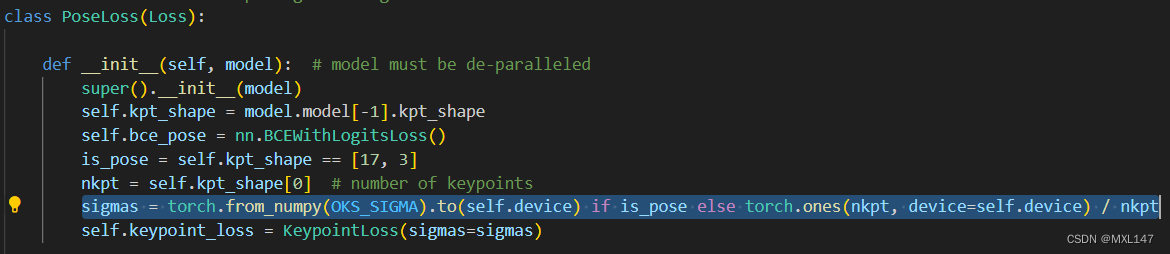 sigmas指定每个关键点分配的权重,sigmas值越小会使loss越大,也就是越希望哪个点准,越应该把该点的sigmas值调小。进行人体关键点观测时默认用OKS_SIGMA,定义在yolo\utils\metrics.py中,OKS_SIGMA = np.array([.26, .25, .25, .35, .35, .79, .79, .72, .72, .62, .62, 1.07, 1.07, .87, .87, .89, .89]) / 10.0,否则所有点赋予同样的权重。