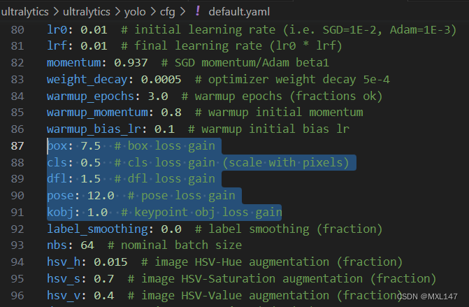 四种损失通过超参数进行平衡。ultralytics\ultralytics\yolo\cfg\default.yaml中对该参数进行了设置: