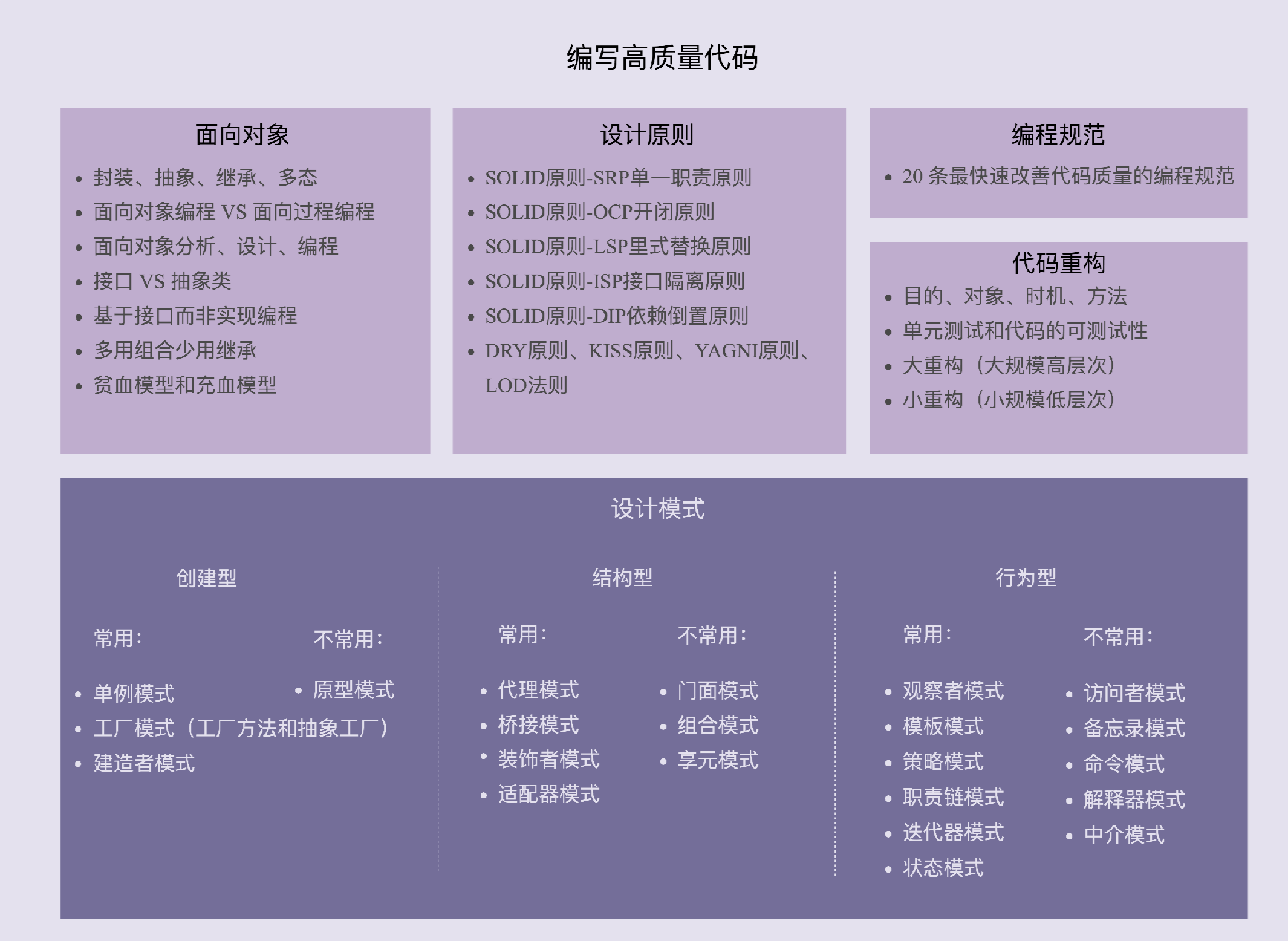 常见的评判代码好坏的词汇:其最常用的几个评判标准:可维护性,可读性,可扩展性,灵活性,间接性,可复用性,可测试性。代码易维护:不破坏原有设计、不引入新bug的情况下,能够快速修改或者添加代码。代码的可维护性是由多因素共同作用的结果:是否符合编码规范,命名是否达意,注释是否详尽,函数长短是否合适,模块划分是否清晰,是否符合高内聚低耦合。很直观的评判:如果一段代码很容易被读懂,说明可读性好,如果读完代码后有很多疑问,那就说明有问题。代码可扩展性指的是:在不修改或者少量修改原有代码的情况下,通过扩展的方式添加