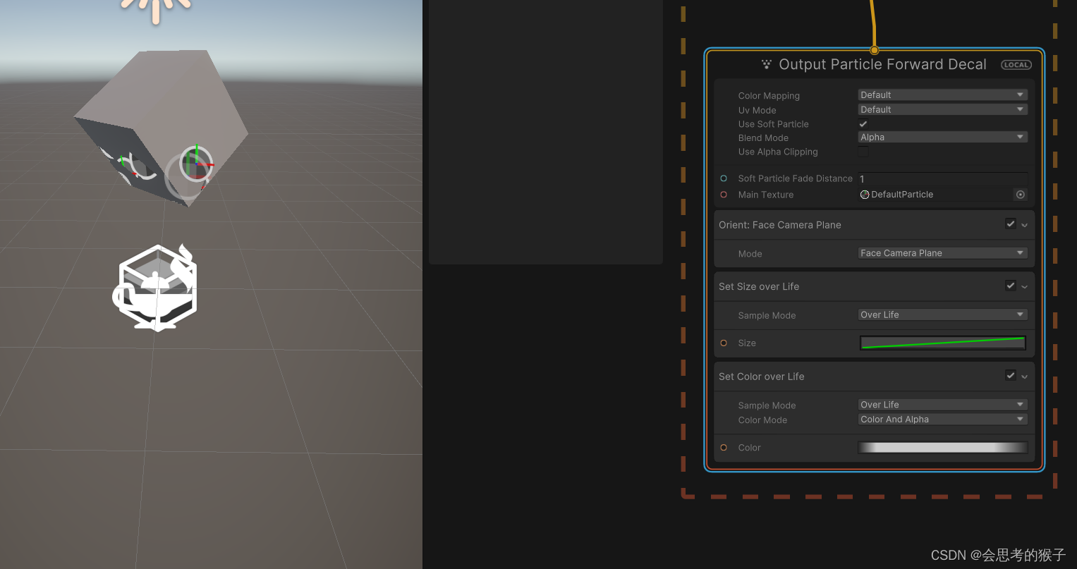 输出粒子前向贴花上下文使用贴花渲染粒子系统。贴花是 Visual Effect Graph 将纹理投影到其中的框。然后 Unity 在沿其 xy 平面的任何相交几何体上渲染纹理。这意味着不与任何几何体相交的贴花粒子不可见。请注意,尽管它们不可见,但它们仍然有助于模拟和渲染系统所需的资源强度。