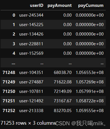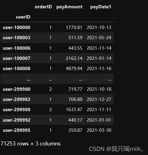 rfm_df = ndf.pivot_table(index='userID',values=['payDate1','orderID','payAmount'],aggfunc={'payDate1':'max','orderID':'count','payAmount':'sum'})