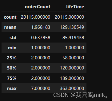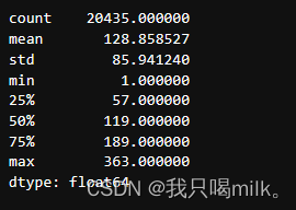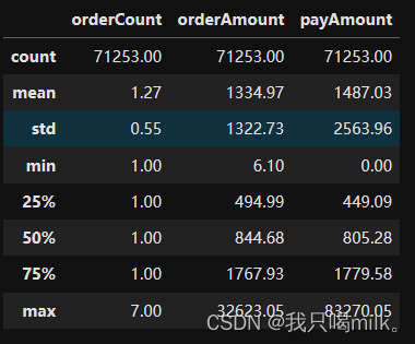count:非缺失值的计数;mean:平均数;min:最小值;25%:第一个四分位数,即25%的数据小于或等于该值;max:最大值;std:标准差。