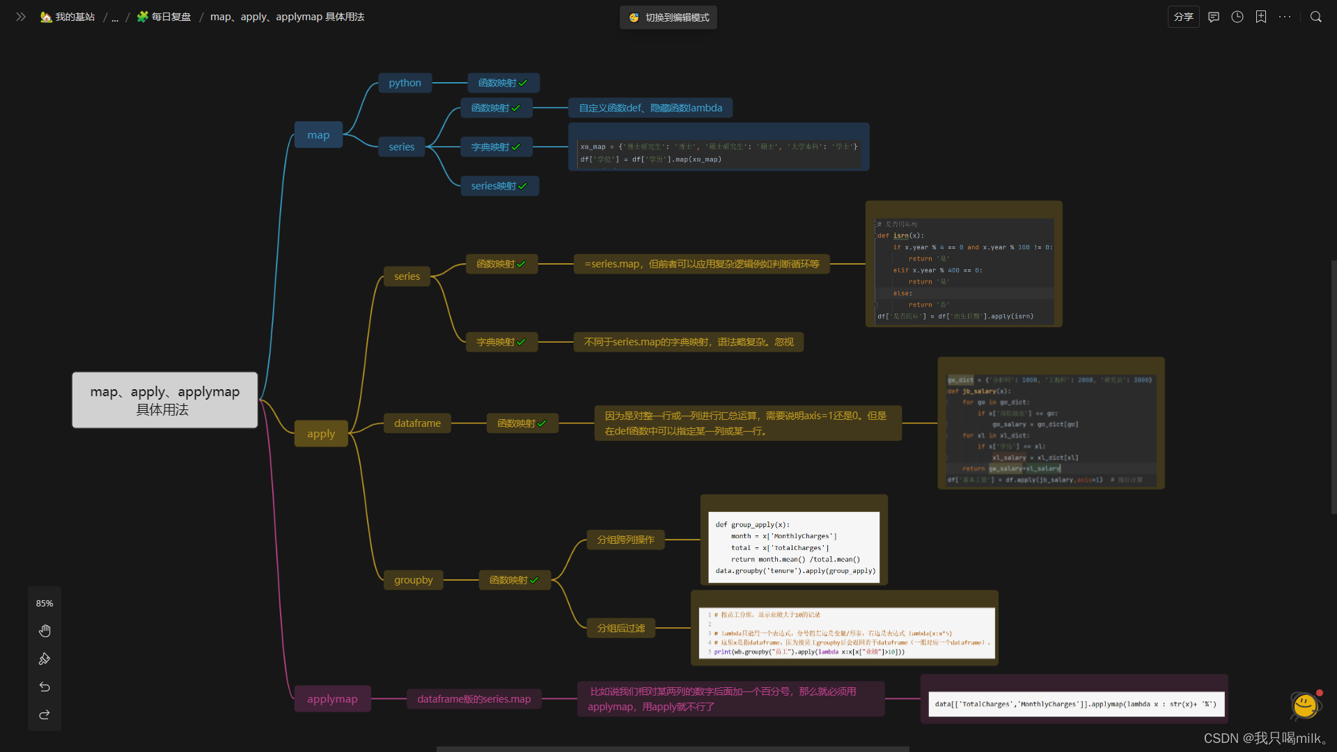 下面附一张map、apply和applymap使用方法的思维导图,仅供参考(可能有需要纠正的地方- -)。