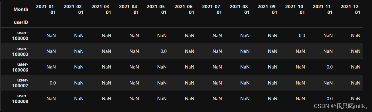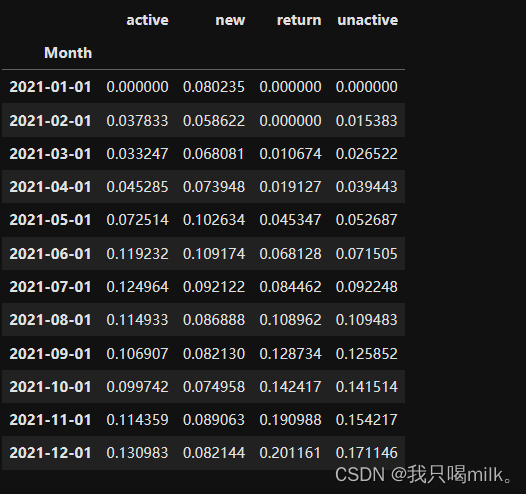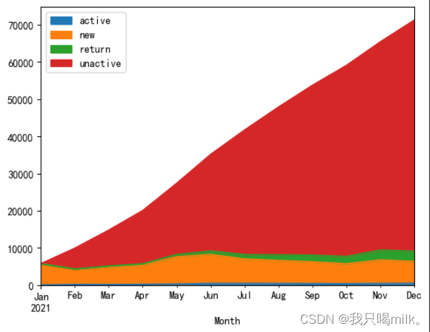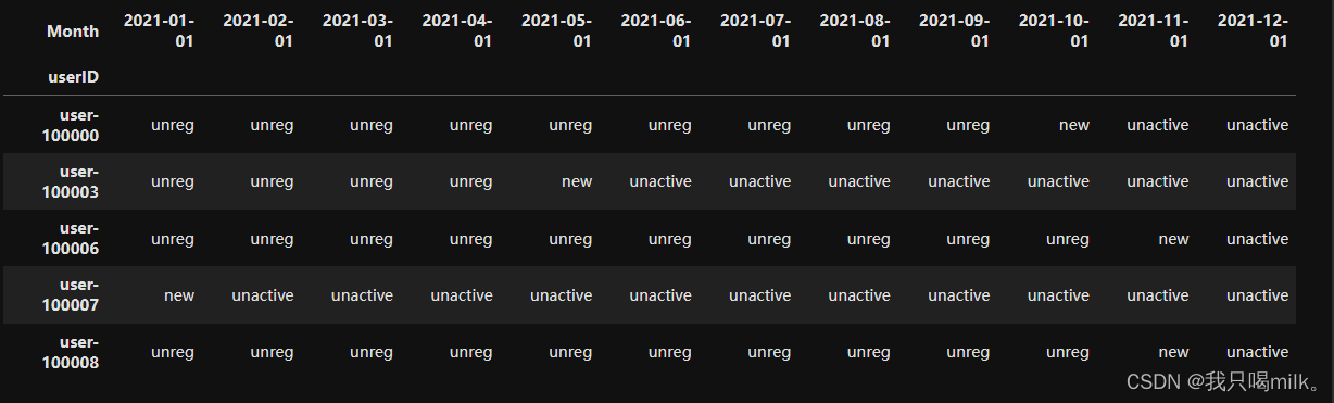 unreg不参与计算,所以给换成NaN了。喏,在这里又用到value_counts()方法了,按月度维度统计new、active、unactive、return的用户数。