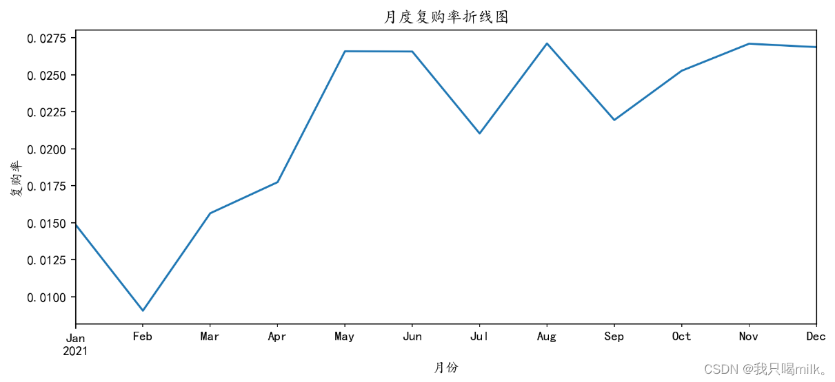 回购率和复购率走势是类似的,但高于复购率,一月到五月一直呈上升趋势,后面逐渐趋于平稳,在5%左右。