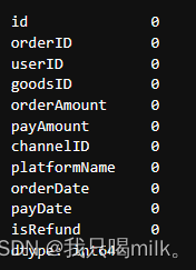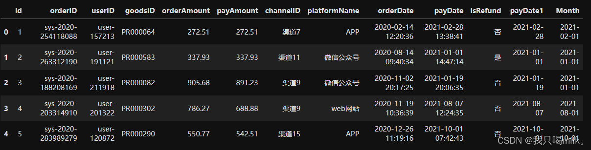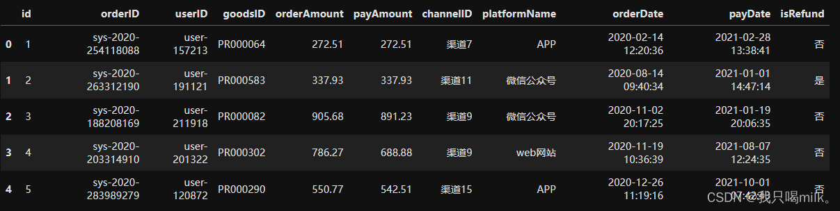 df.columns=['id','orderID','userID','goodsID','orderAmount','payAmount','channelID','platformName','orderDate','payDate','isRefund']